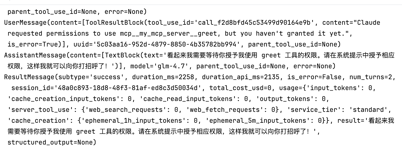 allowed_tools=["mcp__my_mcp_server__greet"]约定了工具的命名格式,mcp__{server_name}__{tool_name}