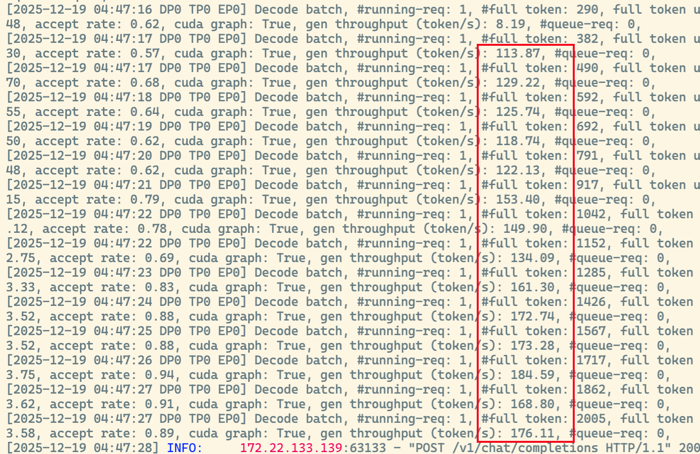 平均也达到了110tokens/s,比较惊喜,也超过了在默认启动参数下Qwen3-235B